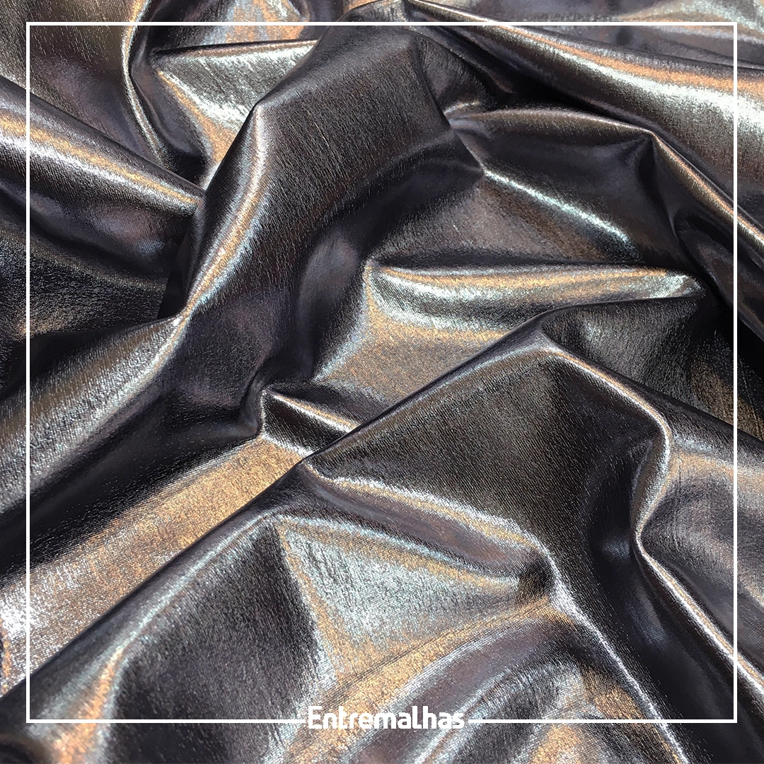 Tecido com acabamento brilhoso de efeito laminado, superfície lisa e toque macio, Tem boa elasticidade, caimento fluido e maleabilidade, facilitando a modelagem de peças ajustadas ou com movimento.