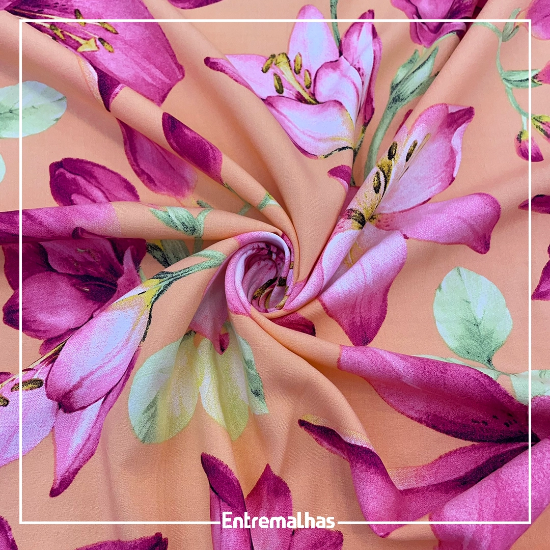 O tecido Viscose Estampa Digital apresenta toque leve e macio, com excelente caimento e respirabilidade. Sua estampa digital garante cores vivas e duradouras, com alta definição dos desenhos. É um tecido confortável, ideal para produções que valorizam o movimento e a fluidez.