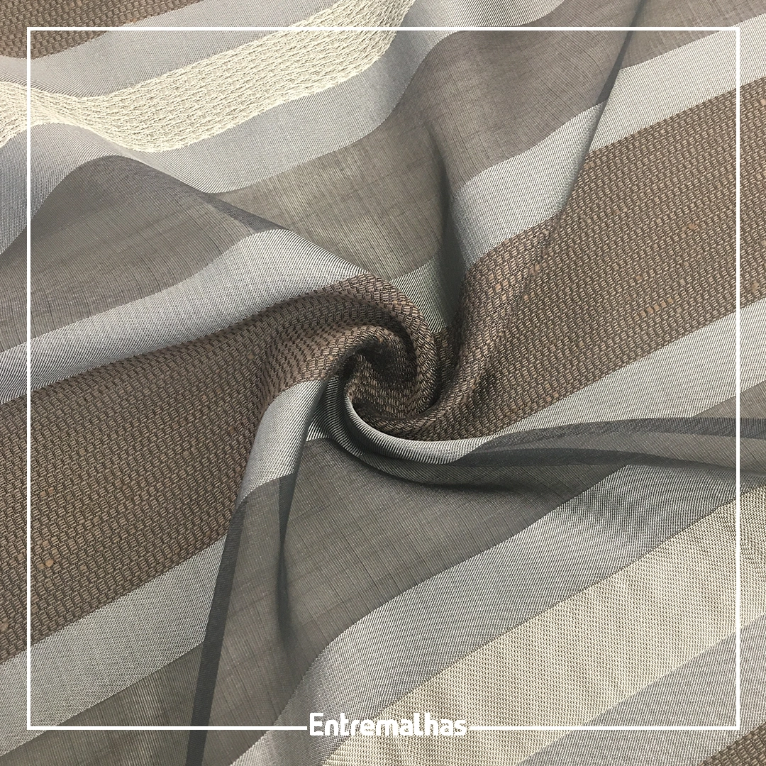 O tecido Voal Listrado é leve e translúcido, com listras que conferem sofisticação e charme. Sua mistura de fibras garante um caimento delicado, ideal para valorizar ambientes com leveza.
